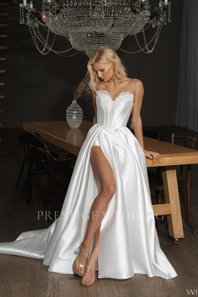 Сочетание скульптурного корсета и лёгких, воздушных лепестков, которые двигаются вместе с тобой. Идеально драпированная юбка с акцентом на талию и высоким разрезом создаёт силуэт, который словно нарисован светом. Оно про грацию, про уверенность и ту самую красоту, которая не требует объяснений. Для невесты, которая хочет выглядеть стильно, свободно и незабываемо.