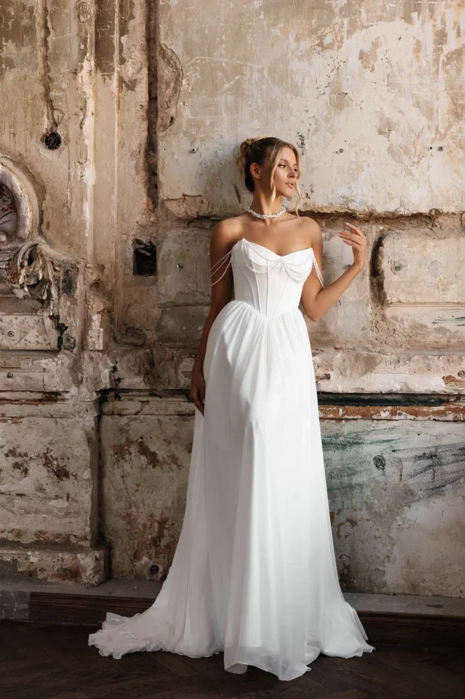 Этот тот самый минимализм, который не требует лишних слов. Платье, будто созданное из мягкого света, повторяет линию тела и подчёркивает фигуру так аккуратно, что кажется — оно просто продолжение невесты.