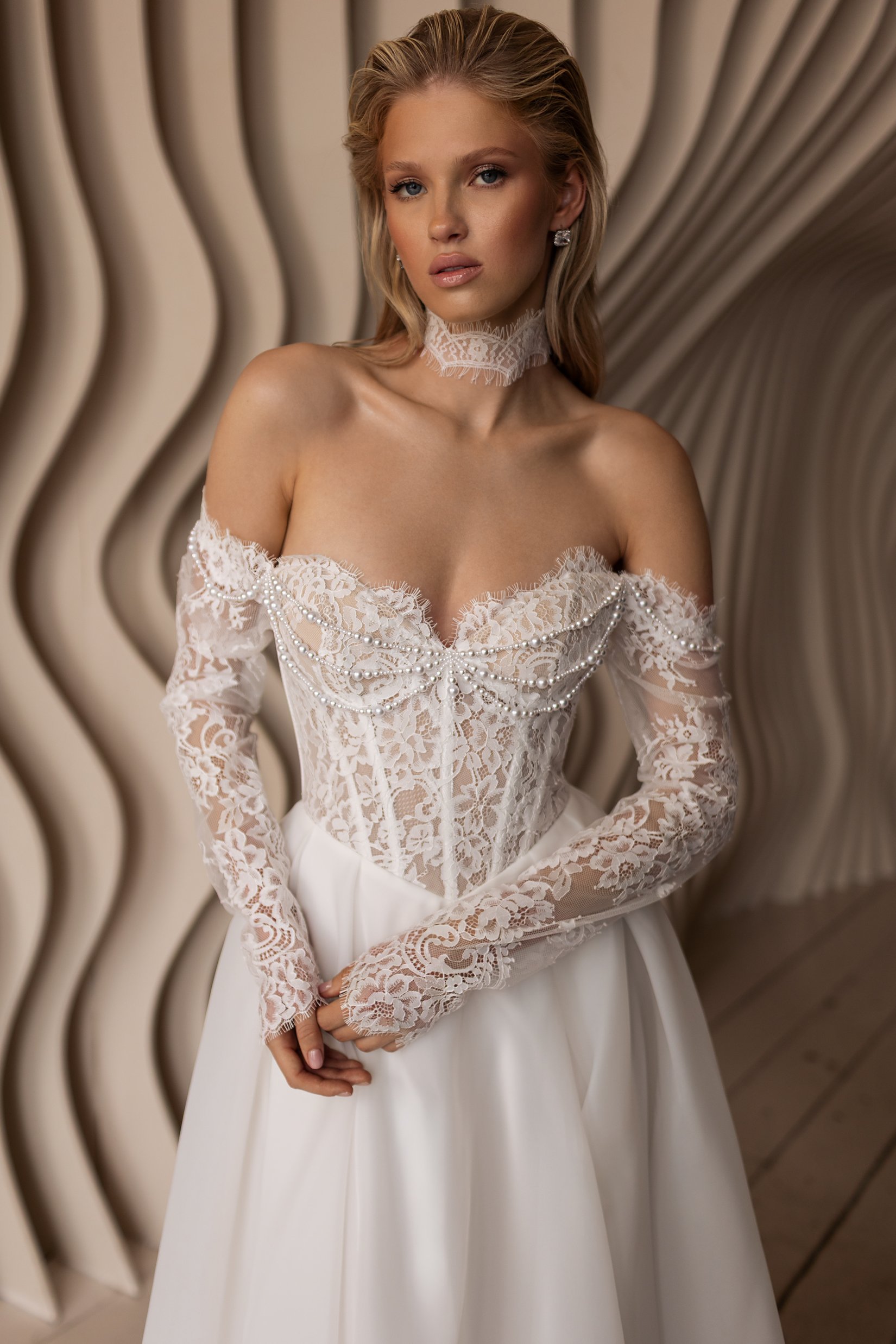Истинная нежность — в деталях. Платье будто создано для невесты, которая хочет соединить классику и чувственность. Полупрозрачный корсет с кружевной вышивкой и капельками жемчуга подчёркивает талию, а воздушная юбка придаёт лёгкость каждому шагу. Отдельное внимание — съёмные кружевные рукава и воротник: будто прикосновение эпохи, которое делает образ благородным и современным одновременно.