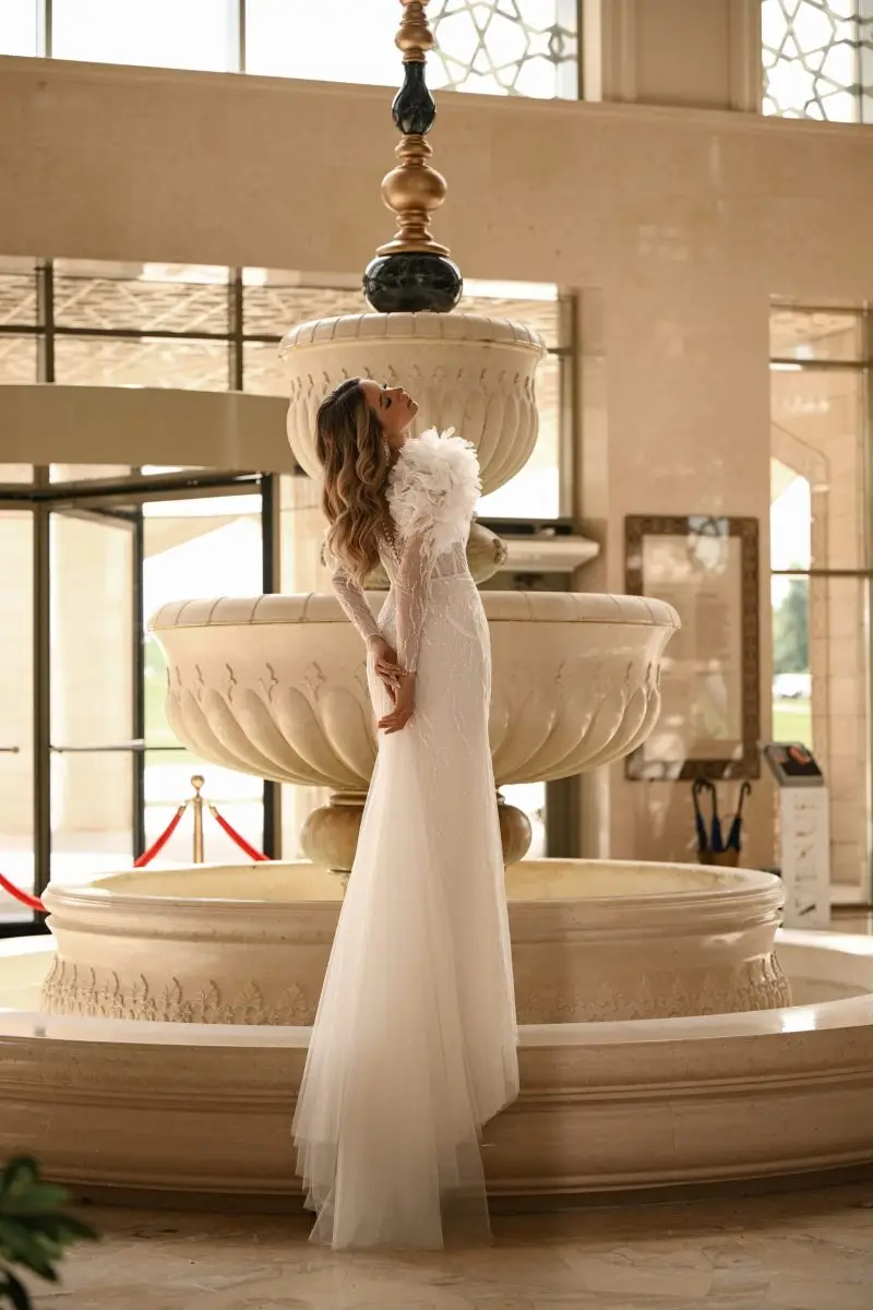 Платье, в котором каждая грань блеска рассказывает историю о роскоши и уверенности. Идеально выверенный корсет, расшитый тысячами пайеток и кристаллов, плавно переходит в струящуюся юбку, создавая эффект живого сияния. Лёгкая фата добавляет загадочности, а мерцающая ткань будто ловит каждый луч света.