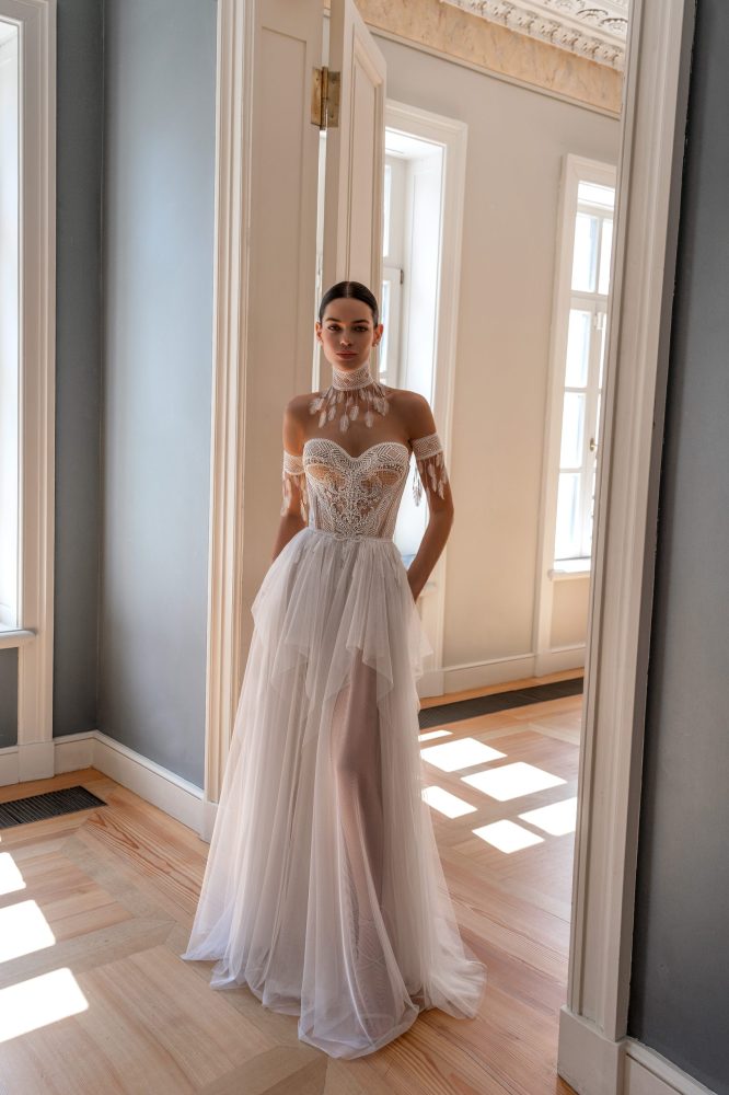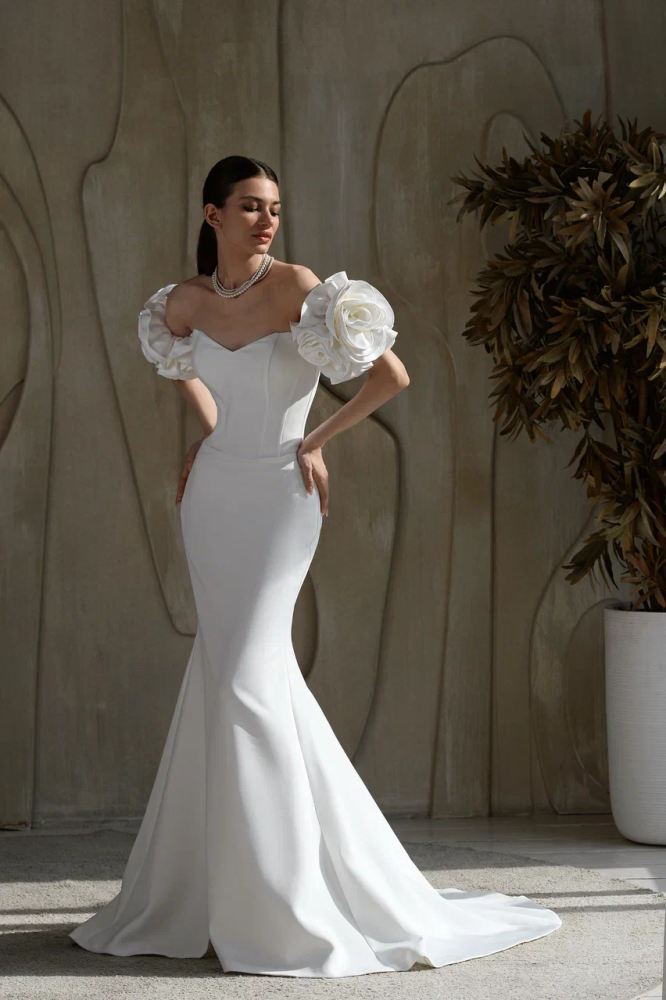 Олицетворение утонченной роскоши. Платье, которое сочетает в себе безупречный стиль и элегантность. Выполненное из кремовой тафты, оно создаст образ изысканной невесты, которая не боится быть в центре внимания. Мини-длинна передней части платья и длинный шлейф сзади придают этому наряду уникальность и динамичность.