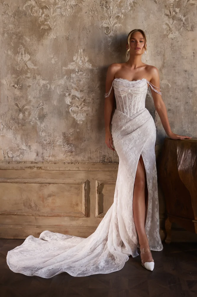 Расшитое пайетками полотно мягко переливается при движении, а открытые плечи и драпированный лиф создают идеальный акцент на женственности. Высокий разрез и струящийся шлейф добавляют динамики и уверенности.