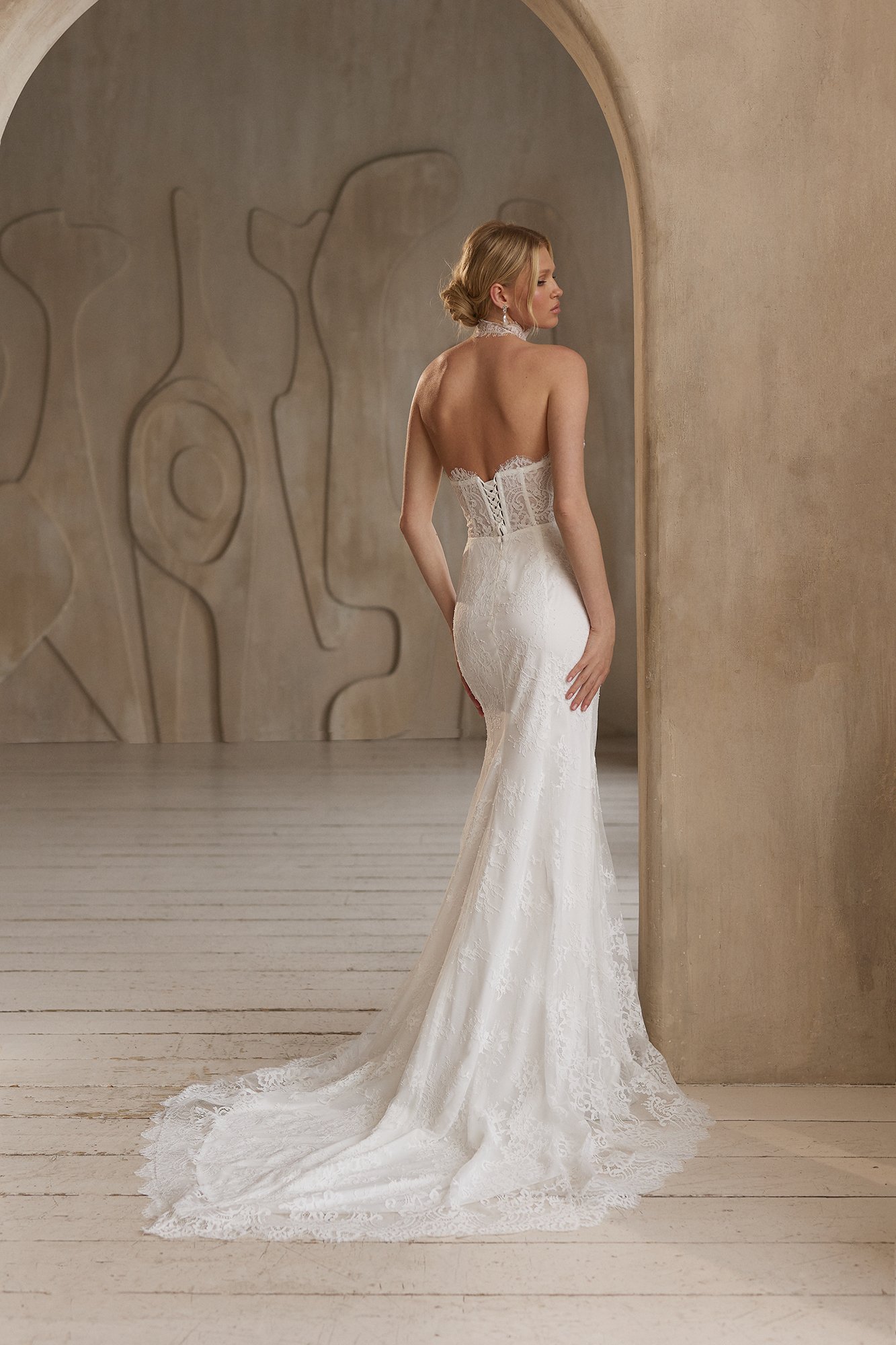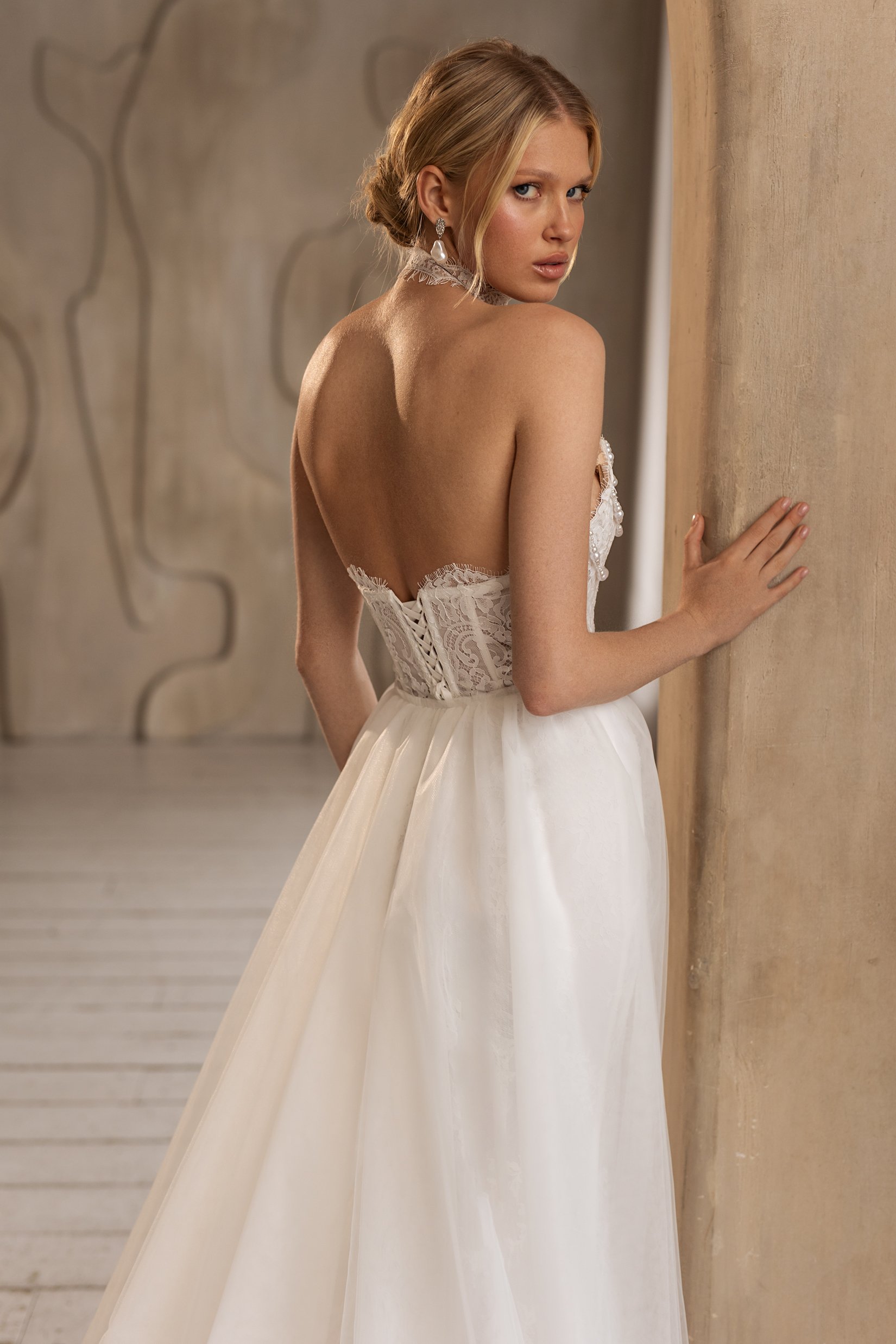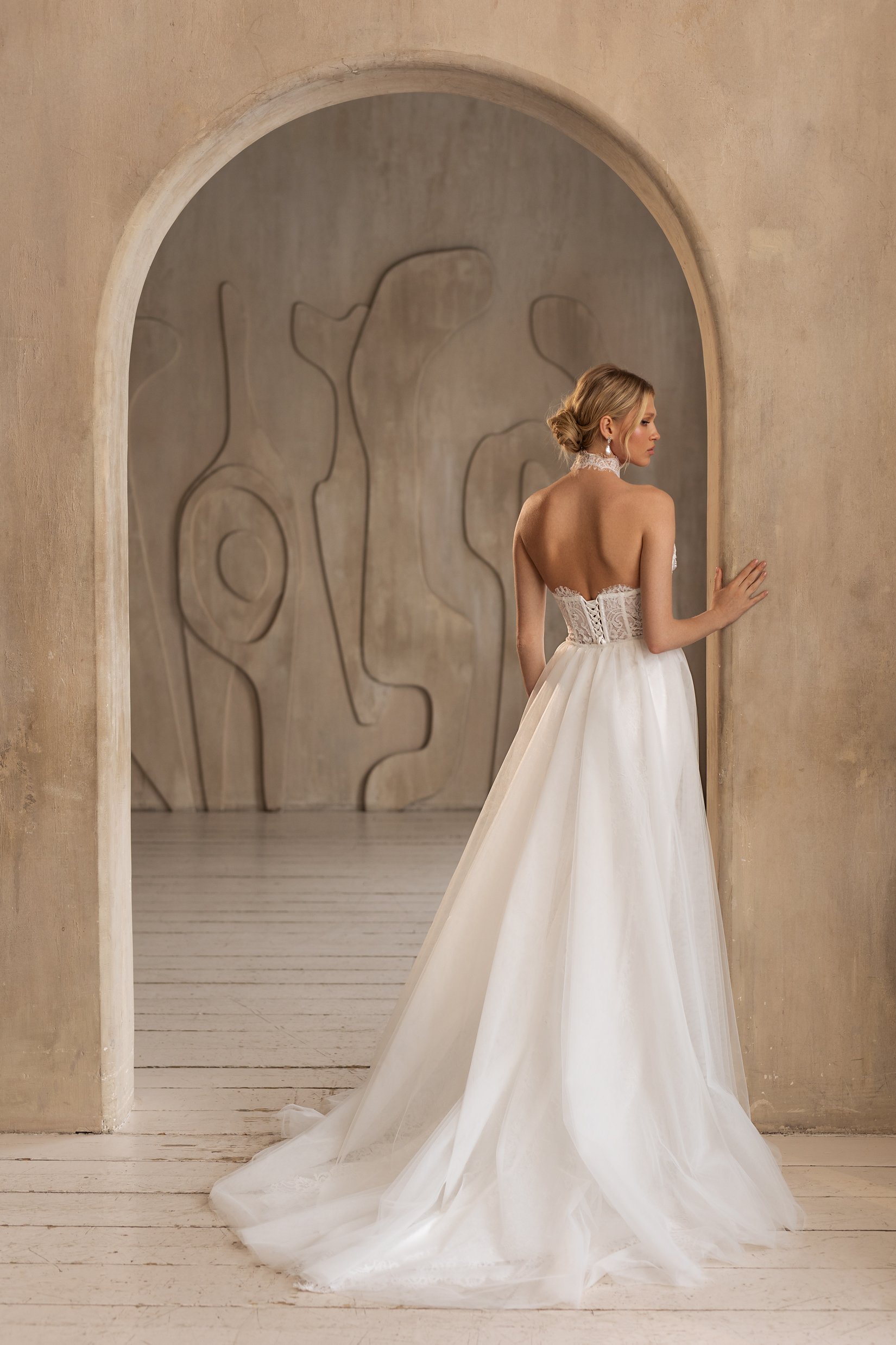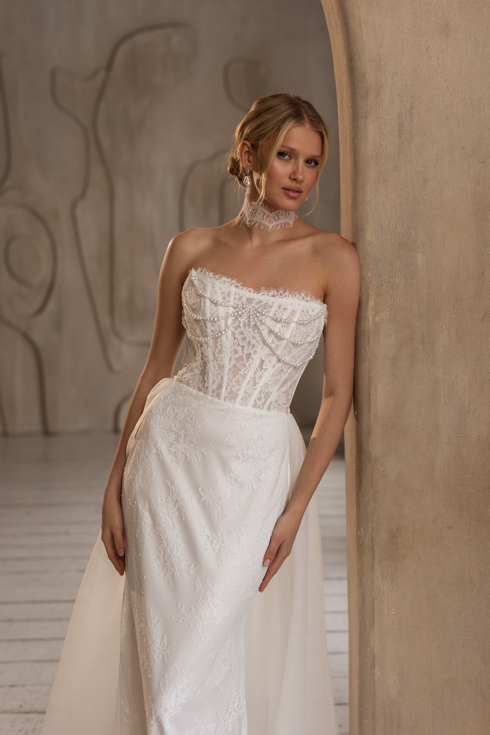 Платье, в котором ты разная. Сексуальное, но благородное. Кружевное, но строгое. Кармела сочетает в себе: архитектурный корсет с жемчужными нитями, изящную посадку по фигуре и съёмный шлейф, который дарит лёгкость движения. В один момент — утончённая королева, в другой — дерзкая муза.