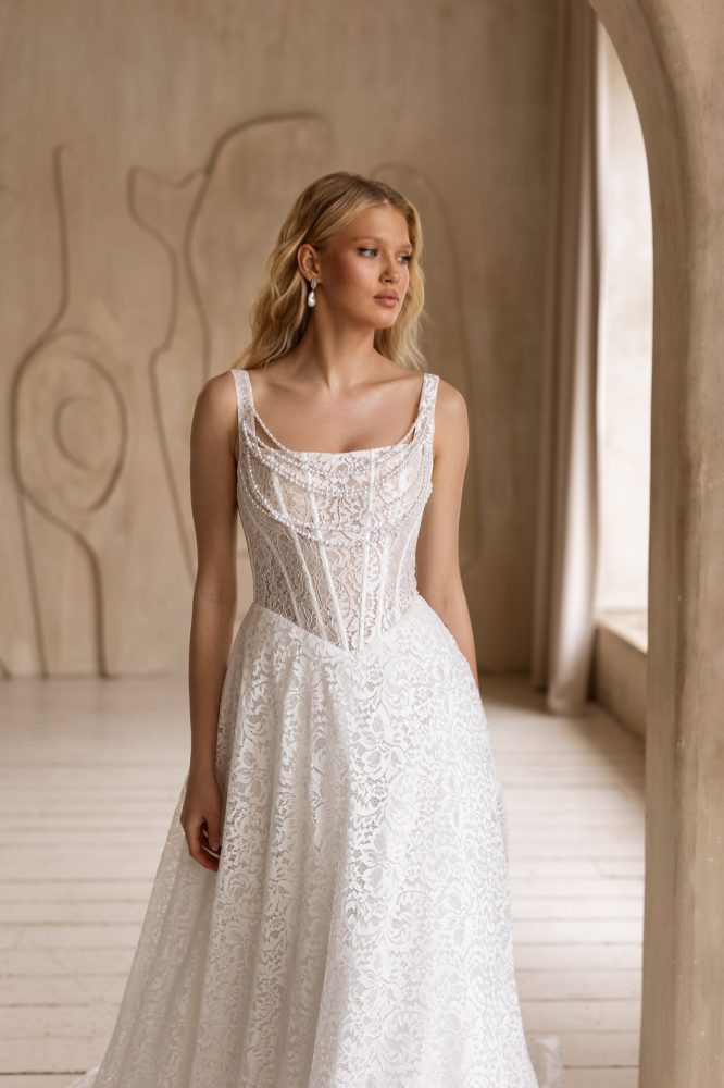 Изысканная модель с открытыми плечами, корсетом, расшитым бисером, и мягкой драпировкой на талии. Прямой крой визуально вытягивает силуэт, а легкое сияние ткани создаёт нежный мерцающий эффект. Платье идеально подойдёт для невест, мечтающих о вечернем образе с ноткой старого Голливуда — утончённом, уверенном и незабываемом.