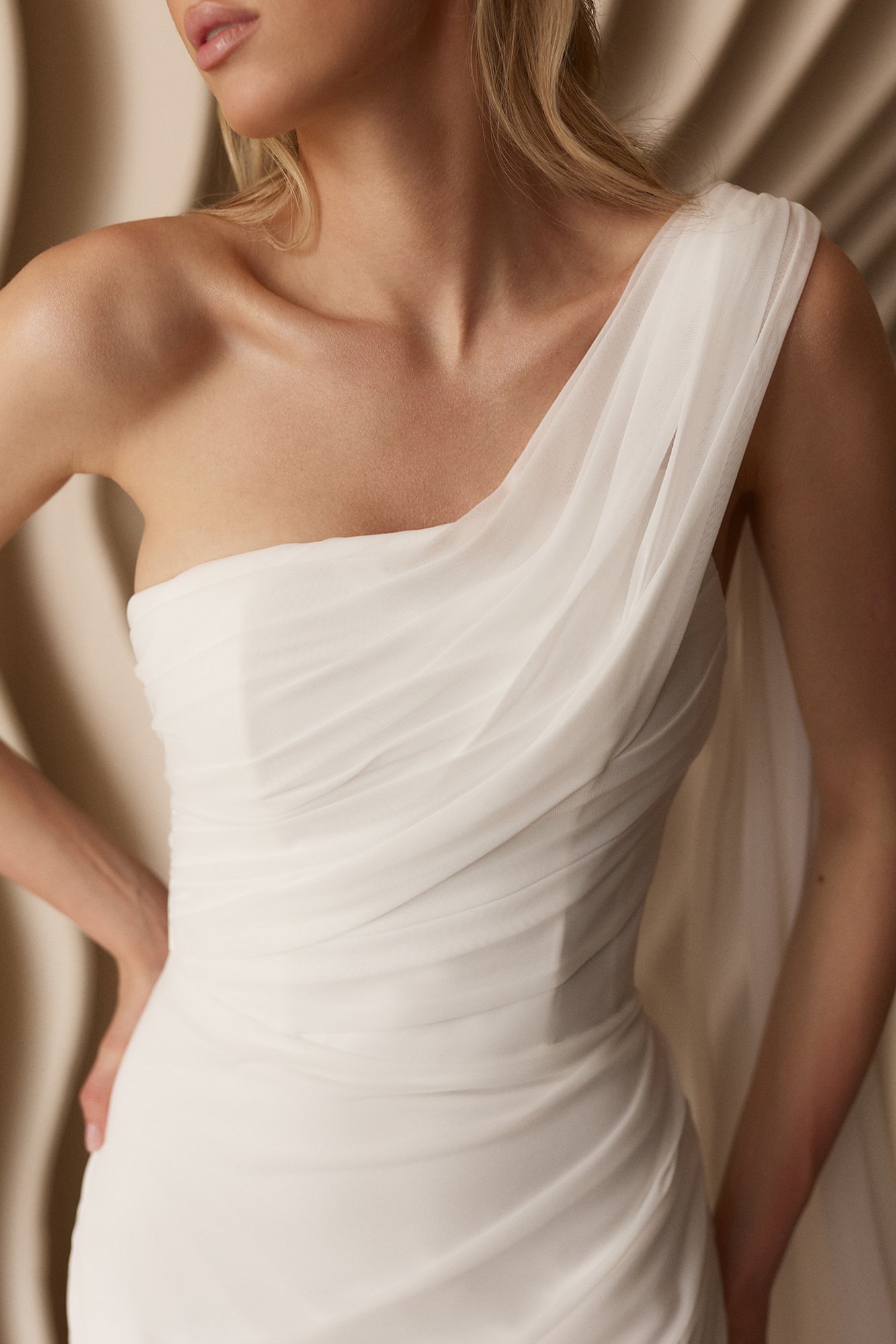 Минимализм, который влюбляет. Перла — это платье, в котором нет ничего лишнего. Скользящий по фигуре силуэт, драпировка на одно плечо и длинный шлейф из органзы создают чистую, сильную линию. Оно будто про внутреннюю тишину, уверенность и вкус, который не требует украшений.