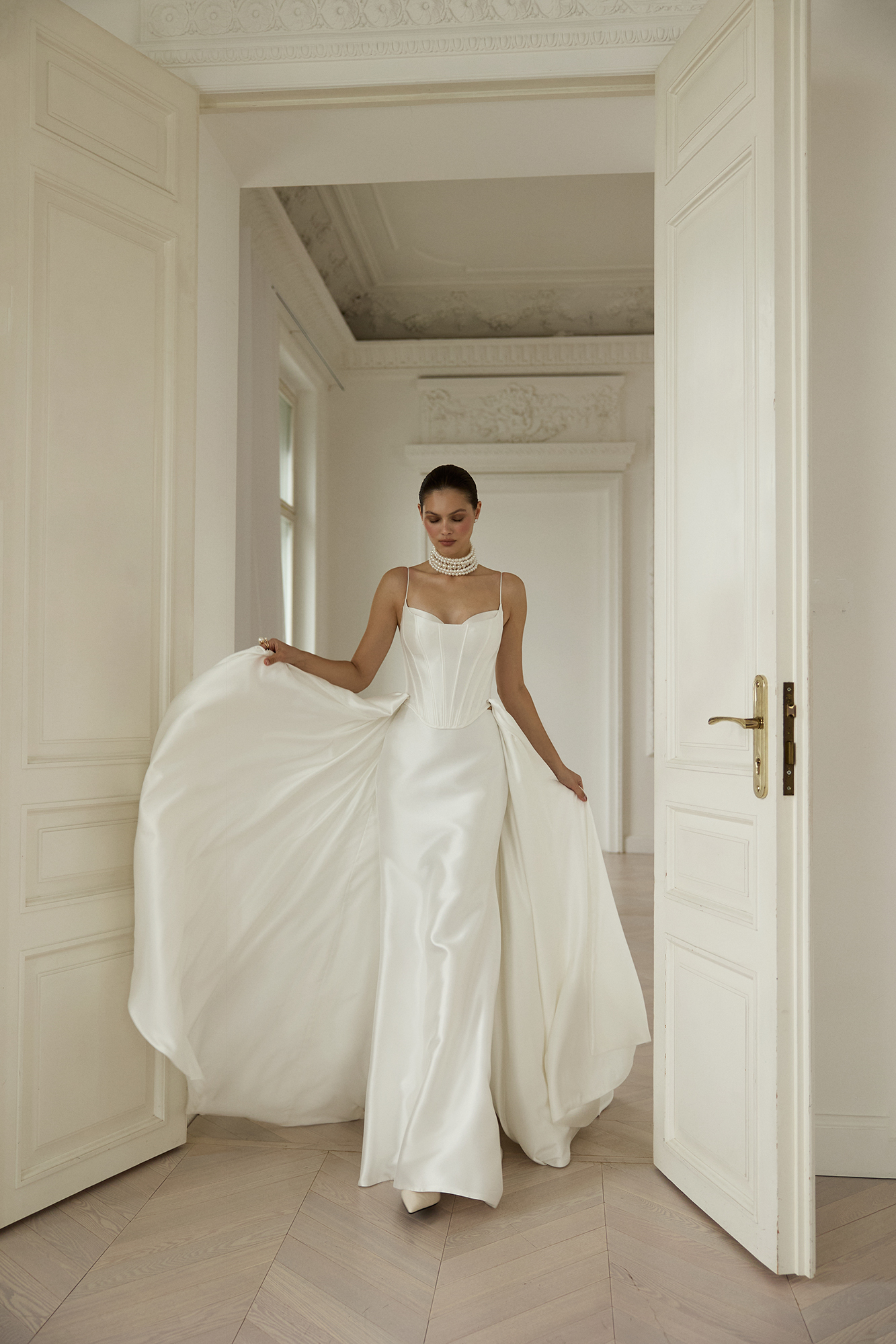 Вдохновлённое классикой платье, которое сочетает элегантный крой с утончённой отделкой. Идеально подходит невестам, которые ценят стиль, классику и стремятся к образу, который будет актуален на любом фоне.