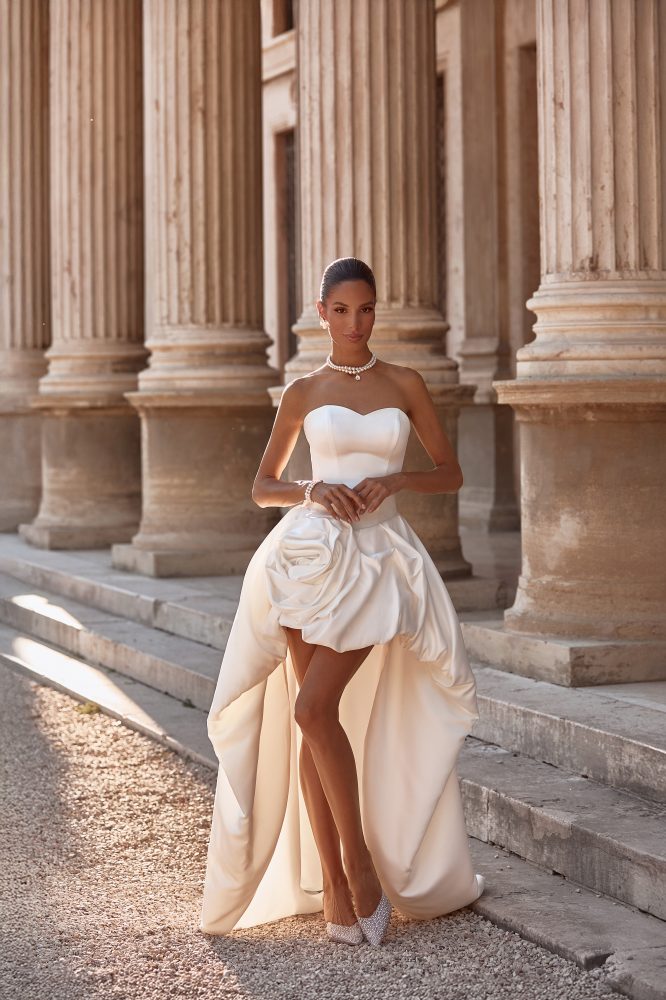 Платье, созданное для эффектного появления. Объёмные рукава и глубокое декольте подчеркивают утончённую линию плеч и превращают образ в настоящее произведение, а вышитый корсет формирует идеальный силуэт. Юбка с архитектурными складками ловит свет и движется, как мини-скульптура.