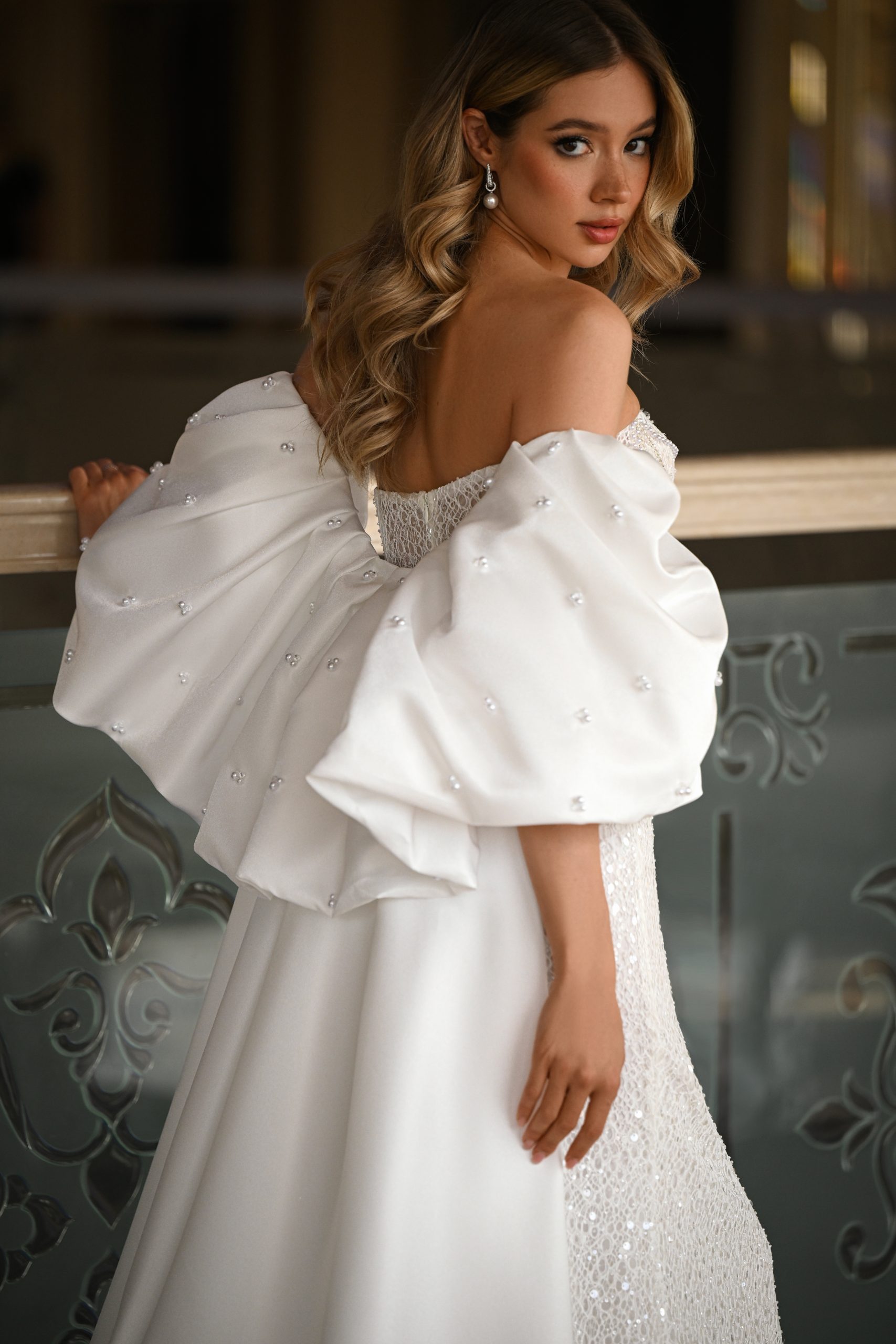 Платье, которое будто создано для невесты, любящей менять настроение и играть с образом. Изящная «рыбка» из мерцающего кружевного полотна подчёркивает талию и создаёт тот самый плавный силуэт, в который невозможно не влюбиться. Объёмное атласное болеро с рассыпанными жемчужными акцентами добавляет драматичности и лёгкого кутюрного настроения. А съёмный атласный шлейф мягко струится за каждым шагом, превращая вход в настоящую сцену.